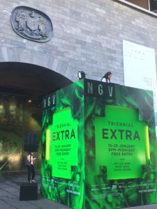 The NGV Triennial also had an event called Extra. Similar to First Thursdays at the AGO or Friday Night Live at the ROM, it’s a chance to be (or act) posh as you listen to music, have drinks and snacks, and are surrounded by art work until the wee hours of the morning. At this event, I met yet another Canadian – yay ex-pats! – and we had a fantastic time. We spent quite a lot of time on third floor which was great – as I hadn’t been yet. There was this really interesting exhibit which was a video playing of Julianne Moore and Alec Baldwin. Moore and Baldwin were portraying stories of refugees and immigrants. In a smaller room behind these giant screens were smaller tvs. On these tvs were videos of the actual refugees. The point of the exhibit was that we only stop and pay attention to stories that are told by celebrities. Those who are viewed as less important in society do not get their voices heard. At Extra, I also tried virtual reality for the first time. Very very cool!
